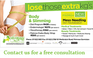 The Ackermans Beauty Salon/Clinic is established in an environment that is condusive to a relaxing & holistic approach atmosphere. The salon consist of 6 treatment rooms attend by fully qualified medical staff, beauty therapists & somatologist.